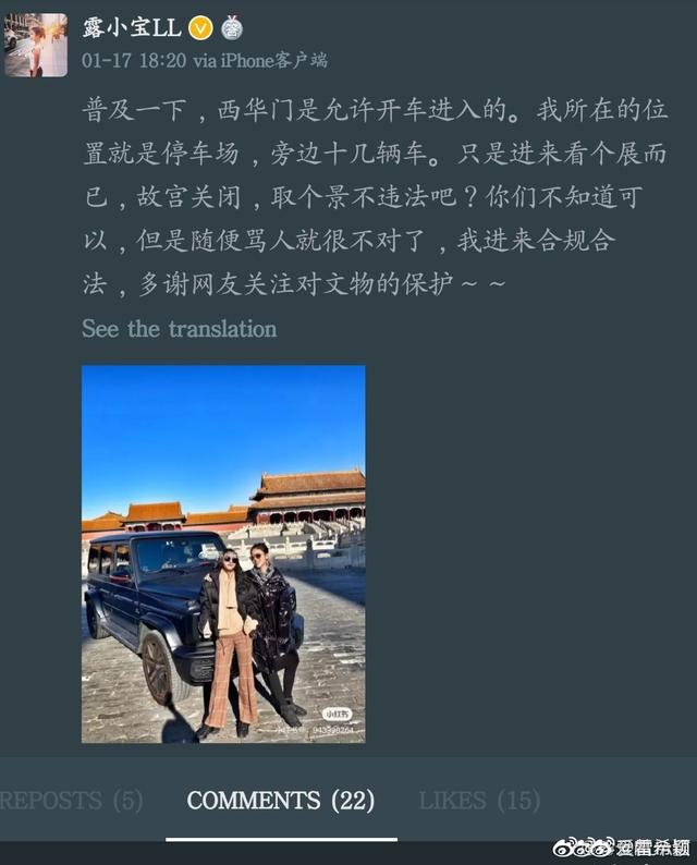 知情人透露,@露小宝LL开进故宫的奔驰越野车与其日常停放在住宅处的是同一辆车。“她家停放的是普通车位,业主们平时都能看到,应该是家庭所有。据说当时是加价买的,在小区里很有名。”