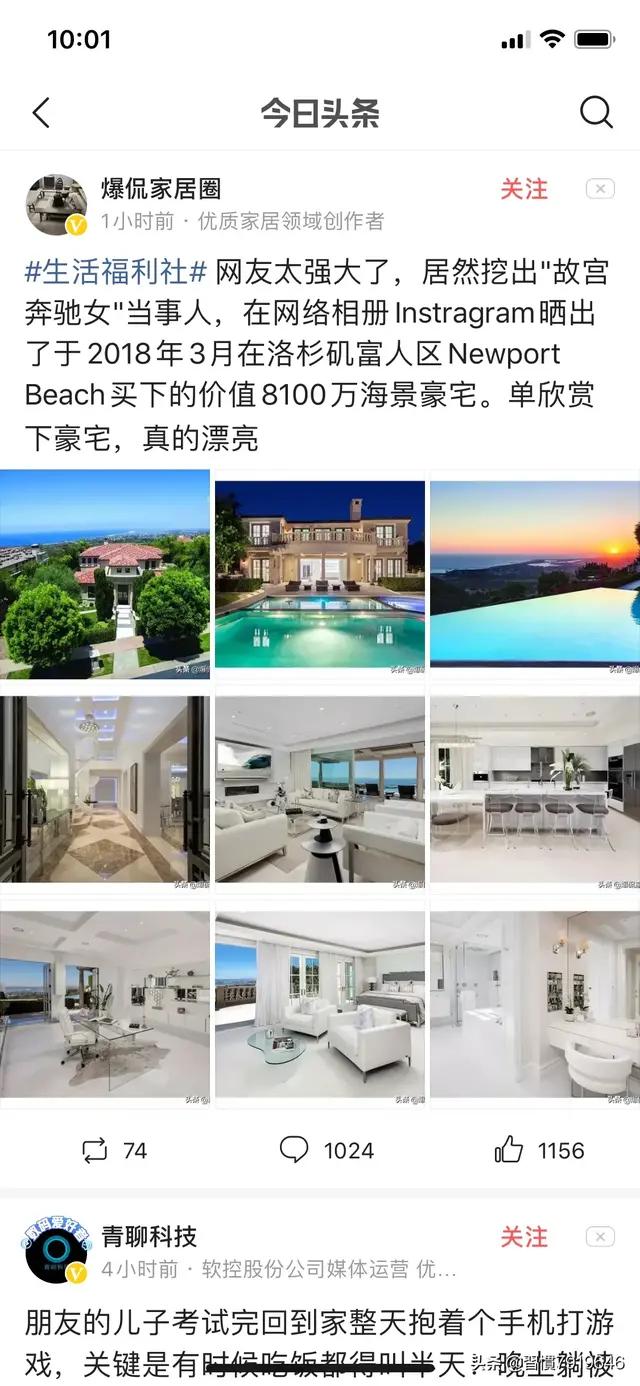 故宫奔驰女此前在社交媒体中发布的一系列内容被网友曝光。其中,2018年3月,其在美国社交网站上发布的一则内容引起关注。故宫奔驰女发布的内容为位于美国洛杉矶的海景豪宅图片,并在下方配文:新买的房子超喜欢。网传这套房产价值数千万元,且房主与忠旺集团创始人刘忠田前妻有所关联。