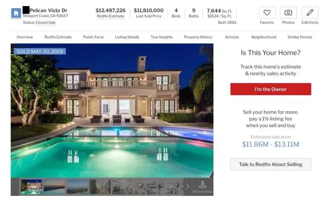 Redfin网页显示,该套房最近一次成交价为1181万美元(合8140万人民币),套内使用面积为7644呎(合715平方米),占地面积为0.45英亩(合1821平方米),共有4个卧室和9个卫生间,一般来说,卫生间数量相对卧室越多,则证明房子越是豪宅。